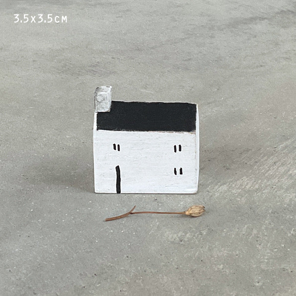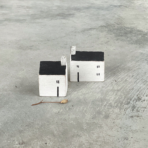 Setje van 2 kleine, houten kusthuisjes. handgemaakte huisjes, ze komen uit Schotland, en daar zie ik ze zo staan, de wind uit zee trotserend