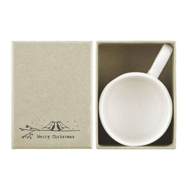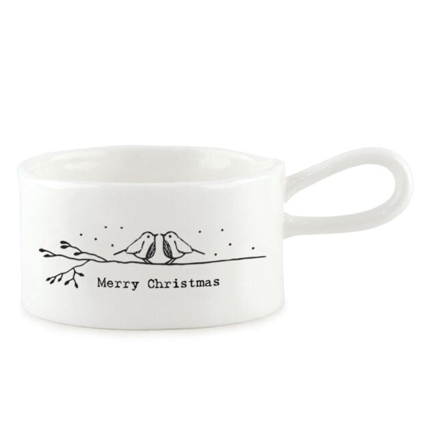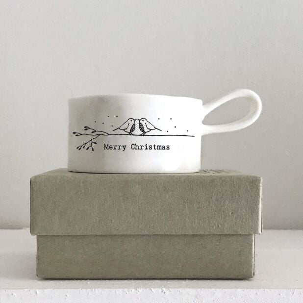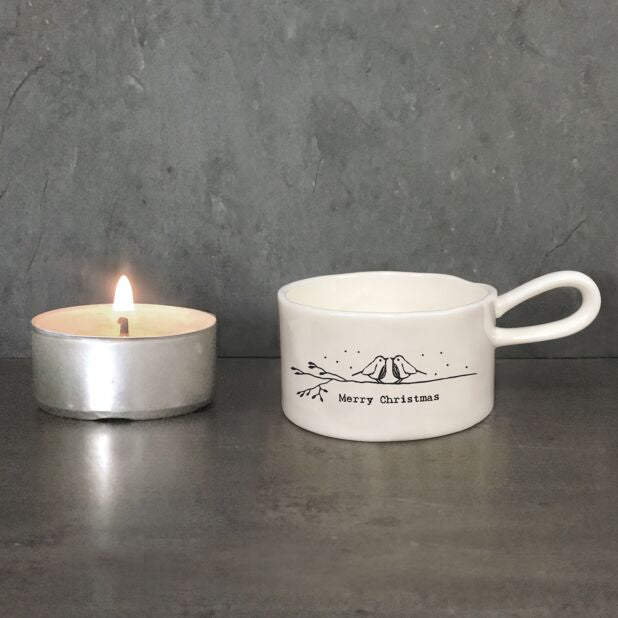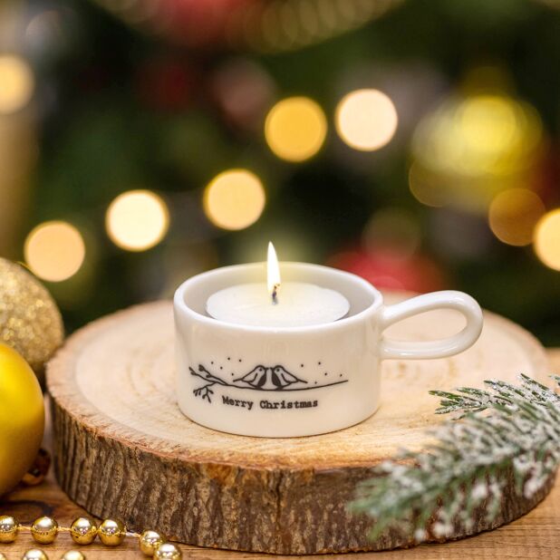 Deze witte kaarsenhouder van porselein toont twee schattige roodborstjes die op een tak zitten en elkaar in de ogen kijken, met daaronder de tekst 'Merry Christmas'. Hij wordt geleverd in een beige doosje met hetzelfde ontwerp als de kaarsenhouder.