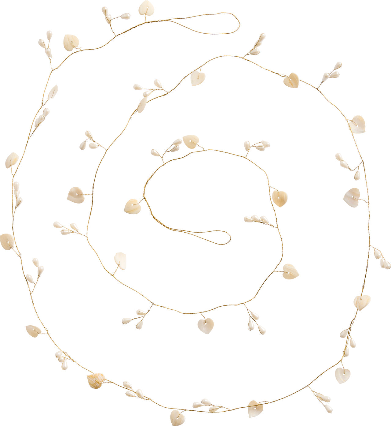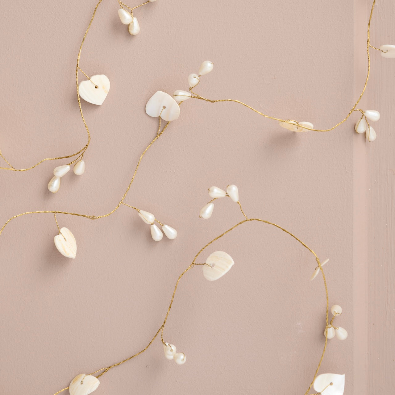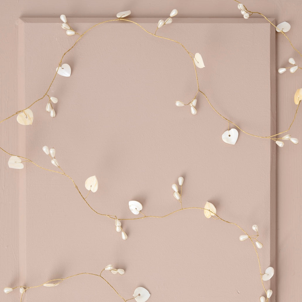 Creëer een betoverende sfeer met deze prachtige slinger van Ib Laursen. Aan het dunne messingdraadje zitten kleine, lieve hartjes en parelmoeren knoppen, klaar om een vleugje romantiek en magie aan je huis toe te voegen.