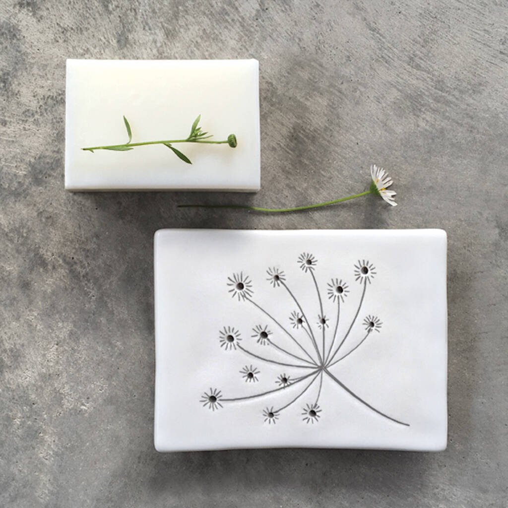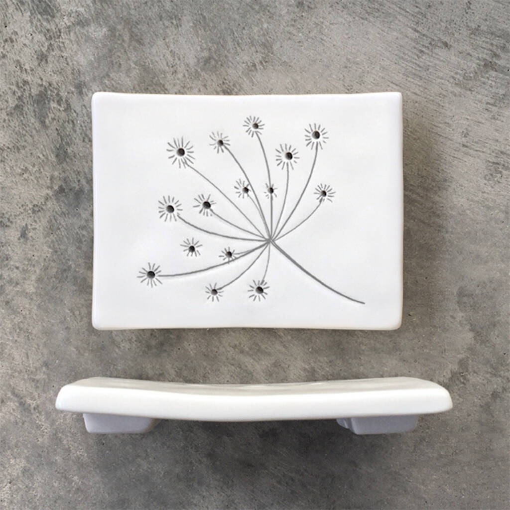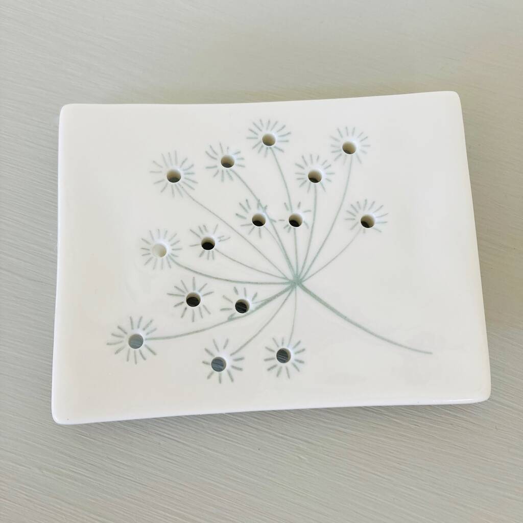 Dit prachtige zeepbakje van porselein heeft een gat in het midden van elke bloem en porseleinen voetjes, zodat de zeep tussen gebruik door kan drogen.