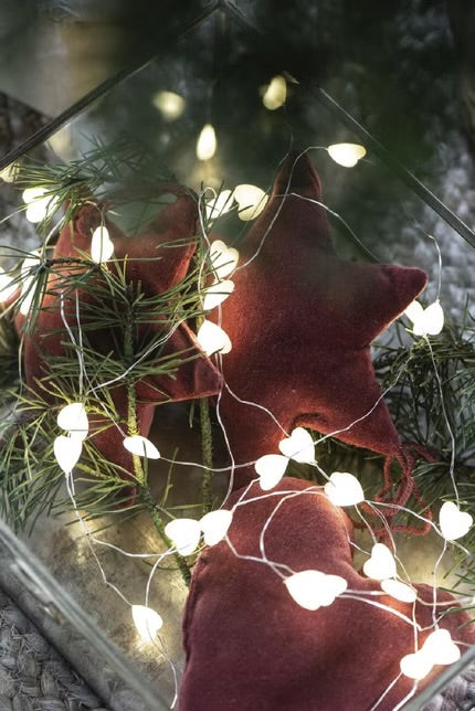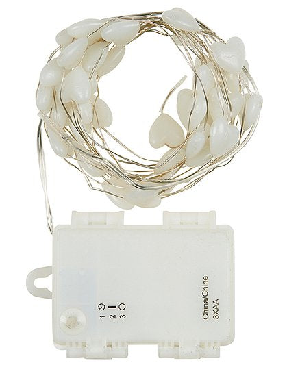 Lichtsnoer met 40 hartjes voor buiten en binnen. Afmetingen (HxBxL):1,5 x 1 x 45 cm. Materiaal:kunststof, metaaldraad. Opmerking:Werkt op 3 AA-batterijen (niet inbegrepen). De lichtslinger is voorzien van een timer: 6 uur aan/18 uur uit.